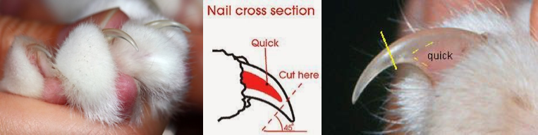 The quick is the pink area on the nail that has blood supply and nerve endings. The quick must never be cut as it will cause pain to the cat and bleeding. Similar to human nails, only the white part of the nail should be cut. Until you’re comfortable cutting your cat’s nails, it’s recommended that you trim off only the tips of the nails to blunt them. Once you have more experience, you can trim closer to the quick. Nails should ideally be cut once per week or at least examined to determine if they need to be trimmed. Each nail grows at a different pace therefore trimming may be required for only some nails at any given time.